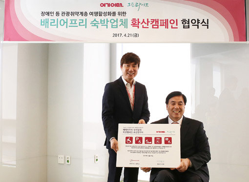 O2O 리딩업체들의 혁신 서비스가 눈길을 끈다. ‘기술과 감성의 조화’·‘고객 신뢰 구축’·‘안심’ 등 각양각색 테마로 고객에게 어필 중이다. 심명섭 위드이노베이션 대표(왼쪽)와 김선규 그린라이트 회장이 ‘배리어프리 숙박업체 확산캠페인’ 양해각서 체결 후 기념촬영을 하고 있다. 사진제공 l 위드이노베이션