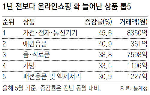 5일 통계청이 발표한 ‘5월 온라인 쇼핑 동향’에 따르면 가전·전자·통신기기의 온라인 쇼핑 거래액은 8350억 원으로 1년 전 같은 기간보다 45.6% 증가했다. 손은락 통계청 서비스업동향과장은 “올해 5월 기온이 평년보다 1.5도 높았고 미세먼지 발생 건수도 전달보다 7배 많아 에어컨, 공기청정기, 의류건조기 등의 판매 증가세가 두드러졌다”고 설명했다.