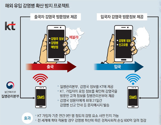 KT는 지난해 질병관리본부, 미래창조과학부 등과 함께 세계 최초로 감염병 발생 지역을 방문한 여행자의 로밍 데이터를 분석해 검역에 활용하는 ‘스마트 검역 시스템’을 구축했다. 통신사 고객들은 감염병 우려 국가를 방문하거나 경유한 뒤 귀국하면 감염병 예방 및 신고 요령을 문자메시지(SMS)로 전달받는 방식이다.