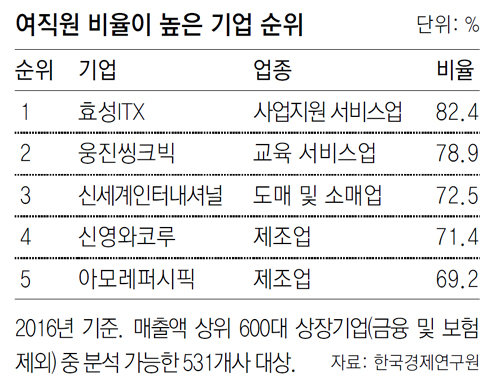 지난해 기준으로 여성 비율이 가장 높은 기업은 정보기술(IT) 서비스업체인 효성ITX(82.4%)였다. 2위 웅진씽크빅(78.9%)과 3위 신세계인터내셔널(72.5%)도 서비스 업체였다. 제조업체 중 신영와코루(71.4%)와 아모레퍼시픽(69.2%)이 4, 5위에 올랐다.
