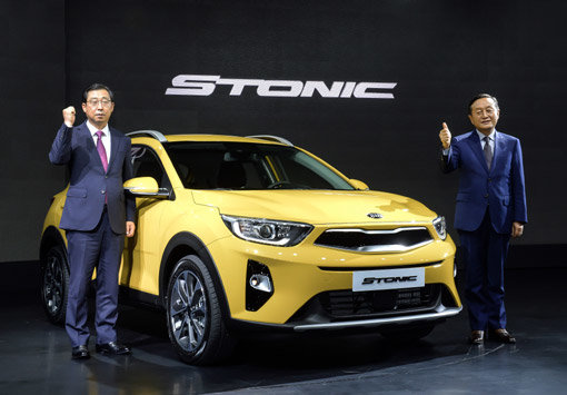 기아자동차는 13일 서울 워커힐 비스타홀에서 소형SUV 스토닉의 공식 출시 행사를 열고 본격적인 판매에 돌입했다. 기아차 박한우 사장(왼쪽)과 김창식 국내영업본부장(부사장)이 스토닉 출시 행사장에서 기념 촬영을 하는 모습. 사진제공|기아자동차