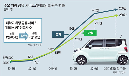 충북대 경영학과 4학년인 기인서 씨(25)는 학교에서 시외터미널이 있는 시내로 나갈 때 차량 공유 서비스(카 셰어링)를 이용한다. 그가 타는 차는 카 셰어링 서비스인 그린카를 운영하는 롯데렌탈이 4월에 시작한 ‘캠퍼스카’ 차량이다. 캠퍼스카는 대학교 교내나 인근에 전용 주차 공간을 두고 대학생들이 카 셰어링을 이용할 수 있게 했다. 기 씨는 “학교에서 시내로 나가려면 택시로 5000∼6000원 정도 나오는 데 카 셰어링은 3000원이면 가능하다”고 말했다. 또 버스와 비교해도 요금 차이가 크지 않고 버스정류장까지 이동하는 시간과 배차 간격 등을 고려하면 카 셰어링이 나을 때가 많다.