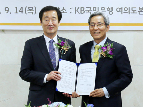 소상공인시장진흥공단은 14일 KB국민은행 여의도본점에서 KB국민은행과 소상공인 금융지원 활성화를 위한 업무협약을 체결했다. 김흥빈 소상공인시장진흥공단 이사장(왼쪽)과 윤종규 KB국민은행장이 협약 문건을 들어 보였다.