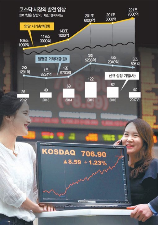 코스닥 시장에 참여하는 투자자들도 늘었다. 코스닥 시장의 일평균 거래량은 2014년 3조5500만 주에서 올해 상반기 7조6900만 주로 증가했다. 기업공개와 유상증자 등을 통한 조달 금액도 2012년 6992억 원까지 줄었다가 지난해는 3조7093억 원으로 급증했다.