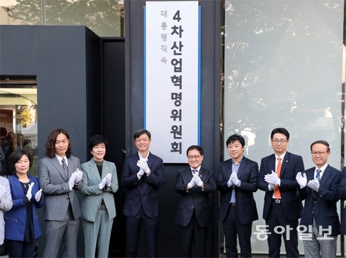 대통령 직속기구인 4차산업혁명위원회가 위원 구성을 마친 뒤 26일 첫 공식활동에 들어갔다. 장병규 4차산업혁명위원장(왼쪽에서 네 번째)이 26일 오전 서울 종로구 KT빌딩에서 김영주 고용노동부 장관(왼쪽에서 세 번째), 유영민 과학기술정보통신부 장관(오른쪽에서 네 번째) 및 위원들과 함께 위원회 현판식을 마친 뒤 박수를 치고 있다. 대통령 공약으로 신설된 위원회는 4차 산업혁명의 기본 방향을 정하고 산업별 대응 방향을 정하는 기구다. 장 위원장은 “위원회는 부처가 추진하는 안을 심의 조정하는 역할”이라며 정책 결정보다는 자문 쪽에 비중을 두겠다는 뜻을 밝혔다.