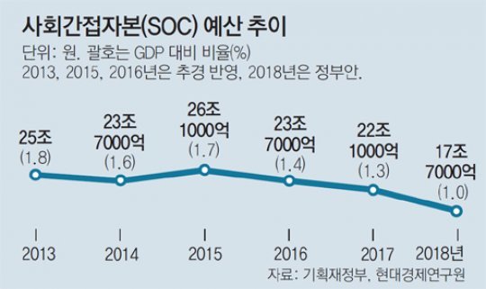 이날 조기행 SK건설 부회장은 “SOC 투자를 줄이면 국민복지와 국가경쟁력이 저하되고 시설 노후화에 따른 국민안전이 위협받을 수 있다”고 우려했다. 일자리 창출 효과가 높은 건설업 위축으로 새 정부가 추진하는 소득주도 경제성장이 어려울 수 있다는 지적도 나왔다. 현대경제연구원에 따르면 건설 투자가 10% 줄어들면 26만6000개의 일자리가 사라진다.