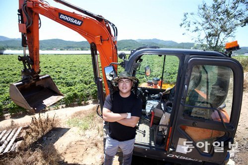 ‘마 캐는 젊은 농부들’ 브랜드를 만든 부용농산의 유화성 대표가 마 수확에 이용하는 포클레인 앞에서 웃고 있다. 유 대표는 올