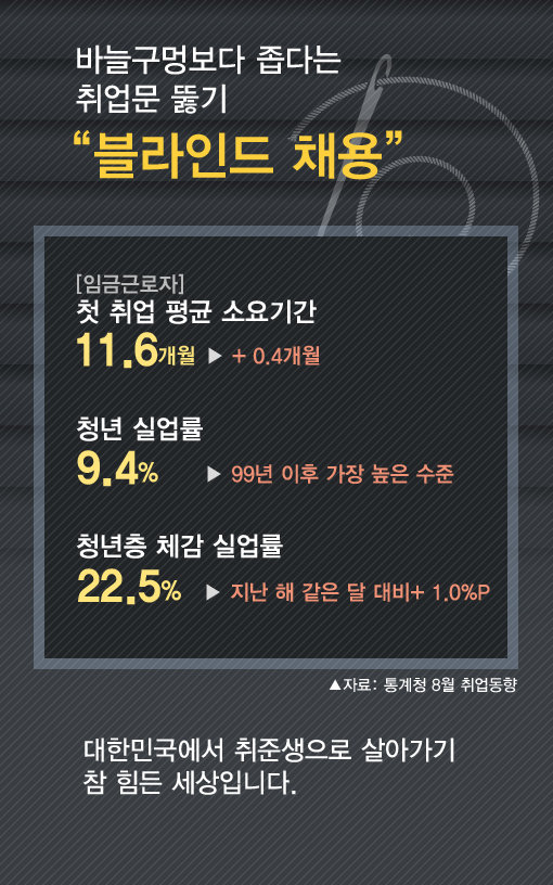 # 바늘구멍보다 좁다는 취업문 뚫기 ‘블라인드 채용’. 대한민국에서 취준생으로 살아가기 참 힘든 세상입니다.