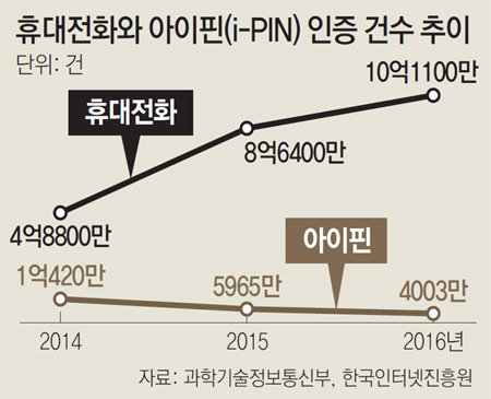 그러나 최근 스마트폰 보급과 온라인 뱅킹에 따른 공인인증서 활용 증가로 아이핀은 점차 외면받는 추세다. 지난해 휴대전화 개인인증 건수는 10억 건을 넘어섰다. 반면 아이핀 인증건수는 4003만 건에 불과해 휴대전화 개인인증 건수의 4%에도 못 미친다.