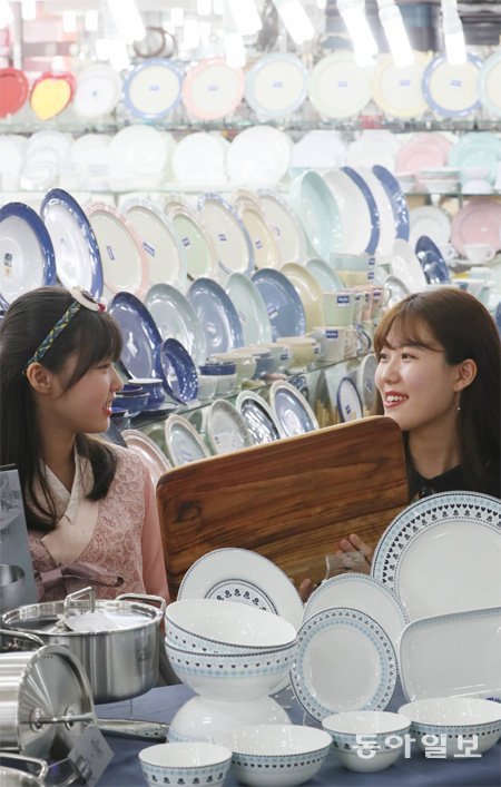 9일 서울 중구 남대문시장 그릇도매상가 직원들이 ‘가을 명품 혼수대전’을 맞아 행남생활건강의 혼수용 신제품을 선보이고 있다. 다양한 업체의 자기 제품들을 한자리에서 구매할 수 있는 이번 행사는 31일까지 열린다.