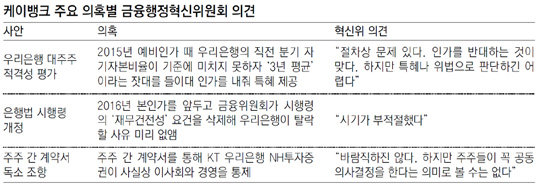 케이뱅크와 관련해 혁신위가 가장 문제가 있었다고 판단한 부분은 우리은행 대주주 적격성 심사 과정이다. 정부가 우리은행에 유리하도록 기존 법령을 무리하게 유권 해석했다는 판단이다.