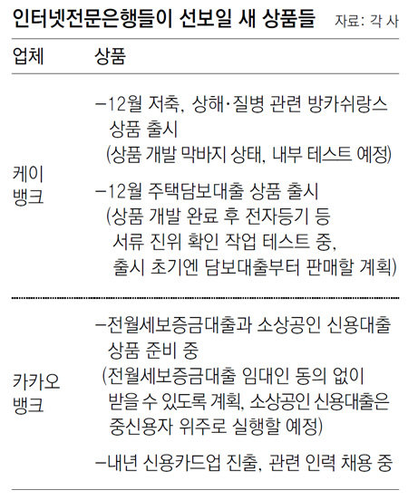 카카오뱅크도 전월세보증금대출과 소상공인 신용대출 상품을 준비하고 있다. 전월세보증금대출은 임대인의 동의가 필요 없이 받을 수 있도록 계획하고 있으며, 소상공인 신용대출은 중신용자 위주로 마련할 예정이다.