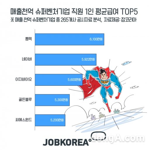 잡코리아의 분석에 따르면 지난 해 매출 1000억 슈퍼벤처기업 중 직원 1인 평균 급여액이 가장 높은 기업은 공장 자동화 설비 기업인 ‘톱텍’으로 직원 1인 평균 급여가 6,100만원이었다. ‘네이버’의 평균 급여가 5,922만원으로 두 번째로 높게 나타났다.