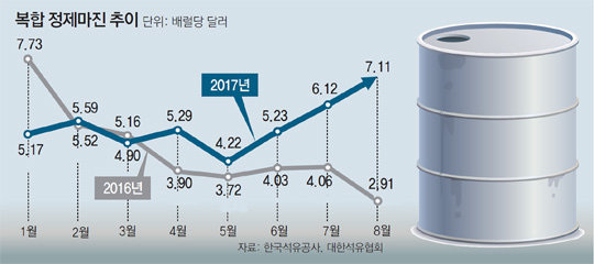 정제마진이 오른 것은 8월 미국 내 정제설비의 30%가 몰려 있는 텍사스 지역을 강타한 허리케인 ‘하비’의 영향이 컸다. 엑손모빌과 아람코 등 세계적 정유회사들의 설비가 타격을 입어 정제설비 가동률이 96.6%에서 77.7%까지 내려갔다. 여기에 더해 7월과 8월 유럽 최대 정유사 셸의 네덜란드와 미국 설비에서 화재가 났고 비슷한 시기 중국 다롄(大連)에 있는 페트로차이나 공장에서도 불이 났다. 높은 가동률을 유지하느라 설비에 무리가 가거나 누전이 발생한 것이 원인이었다.