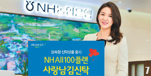 NH농협은행은 최근 상속형 신탁상품 ‘NH All100플랜 사랑남김신탁’을 내놓았다. 이는 고객이 생전에 귀속권리자를 지정하고 500만∼5000만 원을 신탁하면 은행은 고객이 죽은 뒤 상속인들의 별도 동의 없이 미리 설정해둔 사람(귀속권리자)에게 신탁한 금액을 지급하는 상품이다.