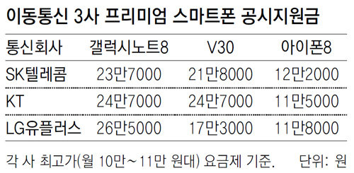 27일 예약판매를 시작한 애플 아이폰8과 아이폰8플러스에 11만∼12만 원 수준의 공시지원금이 책정됐다. 이전 아이폰7 시리즈와 비슷하다. 최대 33만 원으로 제한됐던 휴대전화 단말기 지원금 상한제가 폐지된 지 한 달이 지났지만 소비자는 그 효과를 체감하지 못하고 있다.