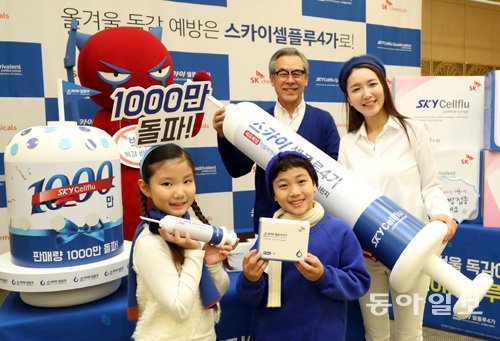 SK케미칼이 29일 서울 종로구 세종문화회관에서 독감백신 ‘스카이셀플루’ 판매량이 1000만 개를 넘어선 것을 기념하는 홍보 행사를 열고 있다.