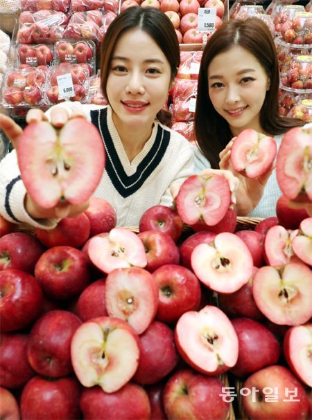 30일 서울 중구 롯데마트 서울역점에서 모델들이 기능성 사과 ‘레드 러브’의 단면을 보여주고 있다. 레드 러브는 속이 빨간 사과로 부사 품종에 비해 안토시아닌, 폴리페놀 등 항산화 성분 함량이 최대 15배가량 많다. 롯데마트 전 점포에서 4개 6900원에 판매한다.