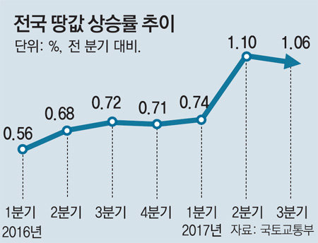 올해 3분기(4∼6월) 전국 땅값이 1% 이상 오른 것으로 나타났다. 8·2부동산대책 등의 여파로 상승세가 다소 꺾였지만 집값 상승률의 2배를 웃도는 상승 폭이다. 또 올 들어 9월까지 누적으로 땅값이 많이 오른 지역으로 부산 자치구들이 대거 이름을 올렸다.