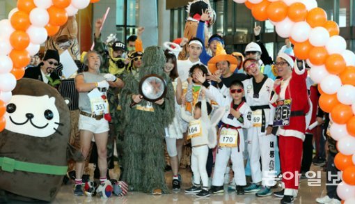 12일 열린 ‘제15회 63빌딩 계단 오르기 대회’에서 이색 복장을 한 참가자들이 출발에 앞서 파이팅을 외치고 있다. 63빌딩 오르기 대회는 총 1251개의 계단을 오르는 국내 최초의 수직 마라톤 대회다. 올해엔 약 500명의 시민이 참가했다.