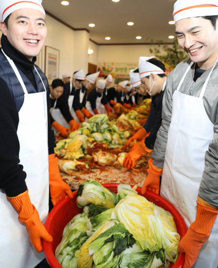 제주항공 남자 승무원 모임인 ‘제남회’ 회원 55명이 12일 경기 시흥시에 위치한 거모종합사회복지관에서 김장 봉사활동을 했다. 이날 만든 김치는 미혼모 쉼터, 다문화 가정, 홀몸 어르신 가정 등에 전달됐다.