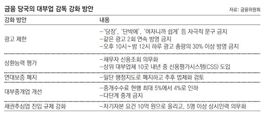 대부업 광고 규제도 강화된다. ‘당장’, ‘단박에’, ‘여자니까 쉽게’ 등 과도한 대출을 유도하는 자극적인 문구를 금지했다. 또 같은 광고를 두 번 연속 방영하는 ‘2회 연속 광고’를 금지하고 오후 10시∼밤 12시 주요 시간대에 하루 광고 총량의 30% 이상을 방영하지 못하도록 했다.