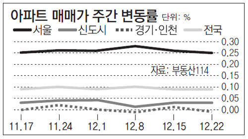 반면 서울 이외 지역은 한산한 분위기를 이어가고 있다. 지난주 경기·인천 아파트값은 0.01% 떨어지며 한 주 만에 다시 하락세로 돌아섰다. 입주물량이 몰린 데다 연말 비수기까지 겹쳤기 때문으로 보인다. 신도시는 0.03% 오르며 전주와 같은 오름폭을 유지했다.