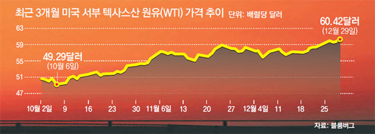 2017년 한 해 동안 WTI는 12.5% 올랐다. 한때 40달러 선까지 떨어졌으나 지난해 4분기(10∼12월)부터 본격적으로 상승하며 약 2년 6개월 만에 배럴당 60달러를 넘어섰다. 한국이 주로 수입하는 중동산 원유 지표인 두바이유 현물가격은 지난해 11월 이후 꾸준히 배럴당 60달러 선을 유지하고 있다.