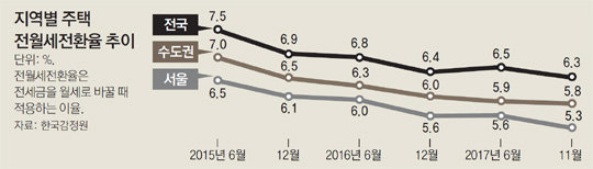 전월세 전환율은 전세금을 월세로 전환할 때 적용하는 이율이다. 1년에 내야 할 월세 총액을 그에 해당하는 전세보증금으로 나눠 구한다. 가령 전세금 4억 원 중 1억 원을 월세로 바꿀 경우 2015년 11월에는 보증금 3억 원에 매달 52만 원을 월세로 내야 했지만 지난해 11월 기준으로는 44만 원만 내면 된다.
