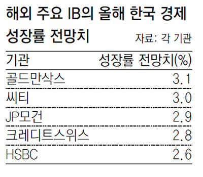 글로벌 투자은행(IB)들이 한국의 올해 경제성장률이 3%에 가까울 것으로 전망했다. 3% 성장률 달성을 좌우할 최대 변수로는 원-달러 환율이 꼽혔다.