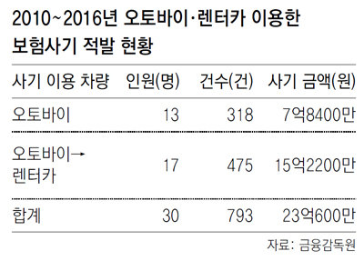 금융감독원은 2010∼2016년 오토바이와 렌터카 사고로 청년층(19∼27세)에게 지급된 보험금과 보험사기인지시스템(IFAS) 내용을 분석해 보험사기 혐의자 30명을 적발했다고 8일 밝혔다. 이들은 모두 793건의 사기 행각을 벌여 약 23억 원의 보험금을 받아 챙겼다. 1인당 평균 26건, 7700만 원꼴이다.