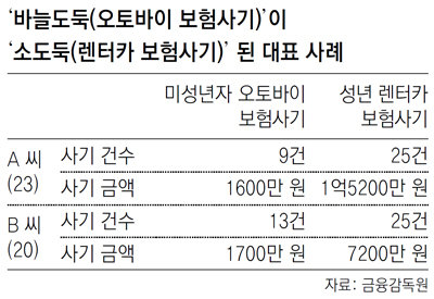 30명 가운데 렌터카로 고의 사고를 낸 17명은 모두 오토바이로 사기를 저지른 전력이 있었다. 이 중 12명은 A 씨처럼 청소년 시절부터 보험사기에 뛰어들었다. 금감원은 “어릴 때 오토바이를 이용하며 사기를 저지른 이들은 성인이 된 뒤 렌터카를 사기에 이용해 더 비싼 보험금을 노리는 사례가 많았다”고 분석했다.