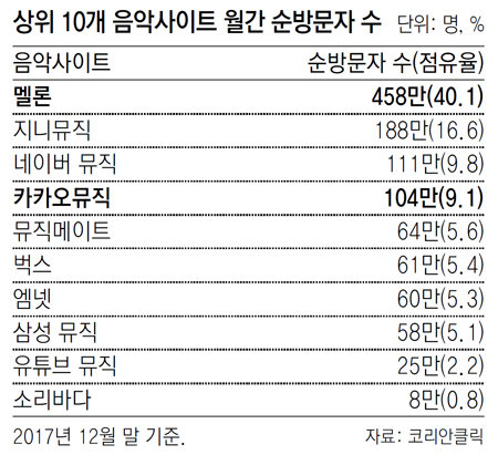 8일 리서치회사 코리안클릭에 따르면 상위 10개 음악 사이트 중 카카오뮤직과 멜론의 월간 순방문자 수는 563만64명(2017년 12월 말 기준)으로 전체(1142만7082명)의 49.2%를 차지한 것으로 조사됐다. 멜론의 순방문자 수는 458만6173명으로 주요 음악 사이트 가운데 가장 많았다. 이어 지니뮤직(188만9812명), 네이버 뮤직(111만3001명), 카카오뮤직(104만3891명), 뮤직메이트(64만3485명)가 뒤를 이었다.