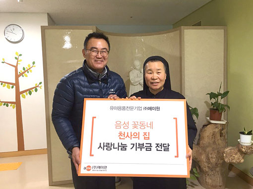유아용품 업체 에이원이 7일 충북 음성군 소재 꽃동네 천사의집에 사랑 나눔 기부금을 전달(사진)했다.