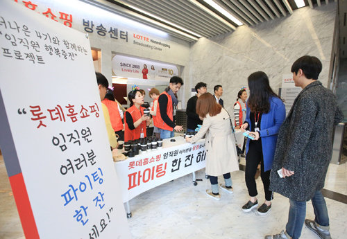 출근하는 직원들에게 임원들이 음료를 나눠주며 격려하는 롯데홈쇼핑의 ‘파이팅! 한잔 하세요’ 이벤트 모습. 롯데홈쇼핑 제공