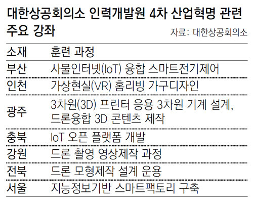 최근에는 4차 산업혁명 시대에 필요한 기술 인력 양성에도 초점을 맞추고 있다. 지난해 대한상의는 인력개발원 산하 서울기술교육센터(서울)와 무인항공교육센터(강원)를 열었다. 두 센터는 정부로부터 각각 ‘4차 산업혁명 선도훈련기관’과 ‘드론전문교육기관’으로 지정받았다. 드론 기술이 영상 촬영, 물류 등 다방면에 쓰이면서 드론 기술자를 필요로 하는 산업계의 목소리를 반영한 것이다.