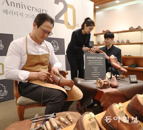 25일 오전 서울 중구 금강제화 명동본점에서 수제화 전문 장인이 금강제화의 고급 수제화 브랜드 ‘헤리티지’ 제품을 만들고 있다. 헤리티지 브랜드 론칭 20주년을 맞아 다음 달 4일까지 열리는 이번 행사를 통해 고객들은 헤리티지 세븐·블랙 전 제품과 리갈, 직수입 구두 등을 20% 할인된 가격에 살 수 있다.