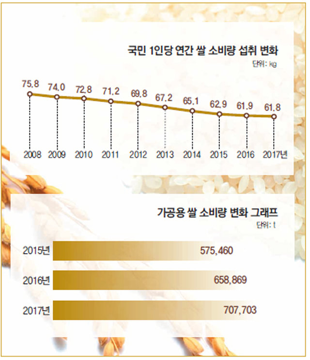 통계청이 발표한 2017 양곡소비량조사 결과에 따르면 가구부문 1인당 연간 쌀 소비량은 61.8kg으로 전년대비 0.1kg 감소했다. 2011년 이후 2∼4%를 유지하던 쌀 소비 감소율이 2016년 1.6%, 2017년 0.2%로 둔화되고 있는 것은 쌀 소비 감소 추세가 정체기에 접어들 가능성을 보여 수급안정에 청신호로 해석된다.
