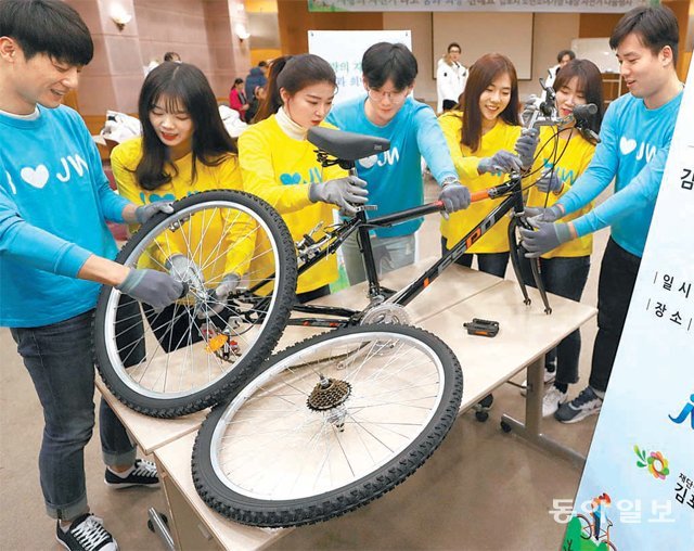 31일 경기 김포시 효원연수문화센터에서 JW그룹 신입사원들이 사회공헌활동의 일환으로 지역 소년소녀가장에게 전달할 자전거를 조립하고 있다.