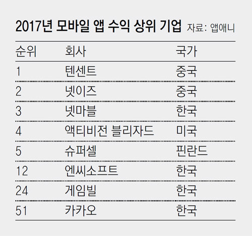 앱애니는 모바일 앱 분석업체로 이날 전 세계 700만여 개의 앱 퍼블리셔(유통회사)를 분석해 매출액 기준 상위 52위 업체를 발표했다. 국내 기업으로는 넷마블게임즈(3위), 엔씨소프트(12위), 게임빌(24위), 카카오(51위)가 이름을 올렸다. 그는 “한국은 전 세계에서 4번째로 큰 앱 시장”이라며 “엔씨소프트 같은 게임 기업이 자체 지식재산권(IP)을 기반으로 모바일 시장에 진출하는 전략이 효과를 보고 있다”고 말했다.