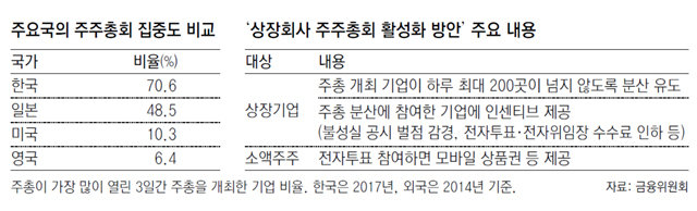 지난해 3월 국내 상장사의 70.6%가 주총이 가장 많이 몰렸던 3일 동안 주총을 열었다. 2014년 기준 이 비율은 일본 48.5%, 미국 10.3%, 영국은 6.4%에 그쳤다. 금융당국은 올해 주총 집중도를 일본 수준으로 낮추는 게 목표다. 조명현 한국기업지배구조원장은 “주총을 3월 안에 열어야 하는 기업들의 부담이 줄고, 개인투자자들은 기업의 의사결정에 참여하는 기회가 확대돼 윈윈 효과가 기대된다”고 말했다.