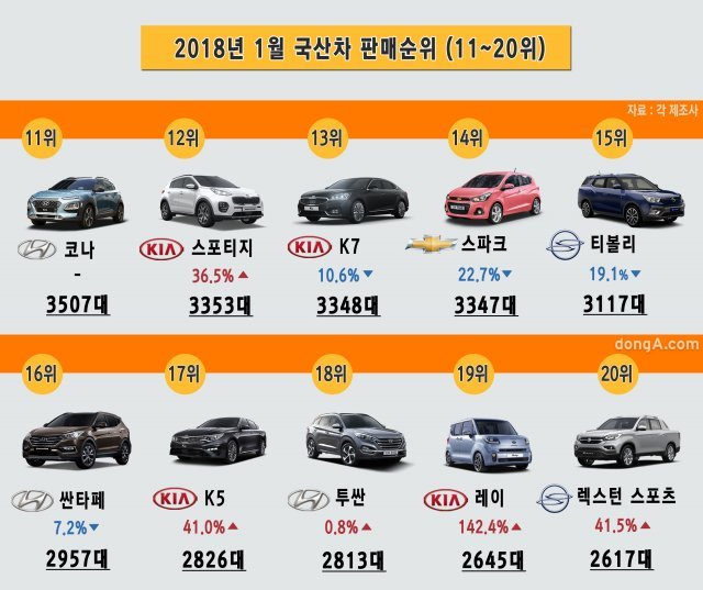 기아차 봉고는 4832대로 6위에 올랐고 7위는 4669대 판매된 카니발이다. 모닝과 제네시스 G80은 각각 4487대, 4047대로 8위와 9위를 기록했다. 3903대 팔린 현대차 스타렉스는 10위다. 다음으로는 코나(3507대)와 기아차 스포티지(3353대), K7(3348대), 쉐보레 스파크(3347대), 쌍용차 티볼리(3117대) 등이 15위 안에 포함됐다. 이어 현대차 싼타페(2957대), 기아차 K5(2826대), 현대차 투싼(2813대), 기아차 레이(2645대)가 뒤를 이었다. 쌍용차 렉스턴 스포츠는 2617대로 출시 첫 달 20위에 오르는 기염을 토했다.