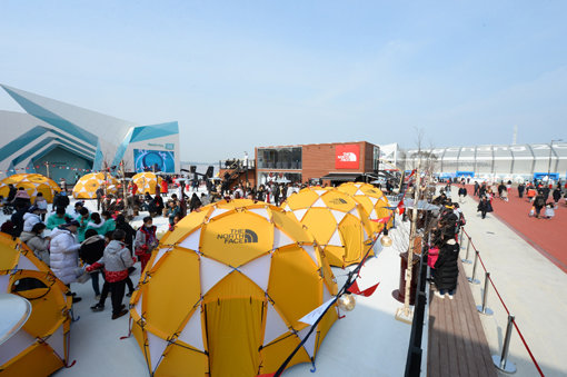 노스페이스의 평창동계올림픽 관련 활동은 대회 기간 중에 더욱 빛을 발했다. 강릉 올림픽파크 내에 위치한 ‘노스페이스 빌리지’는 ‘텐트존’과 ‘캠프파이어존’ 등 색다른 체험과 함께 노스페이스의 동계올림픽 기념 핀을 제공하여, 평창동계올림픽 필수 방문 코스로 자리매김했다.