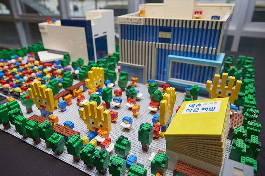 27일 경기 성남시 분당구 판교로 소재 넥슨코리아 사옥에 전시된 블록 장난감 모형. 넥슨이 추진 중인 사회공헌 사업 작은책방, 푸르메재단 넥슨어린이재활병원 등을 형상화했다. 넥슨 제공