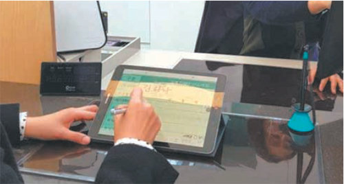 지난해 말 기준 하나은행의 국내 점포 수는 총 776개. 창구마다 태블릿PC를 설치하려면 수천 대를 도입해야 한다. 하나은행 관계자는 “초기 투자비용이 들지만 5년간 운영하면 태블릿PC 도입 전보다 156억 원의 비용을 절감할 수 있다”며 “거래 정보를 종이에 기입할 때보다 더 빠르게 전산에 입력되기 때문에 고객의 업무 처리 시간을 줄일 수 있고, 정보도 더 안전하게 지킬 수 있다”고 설명했다.
