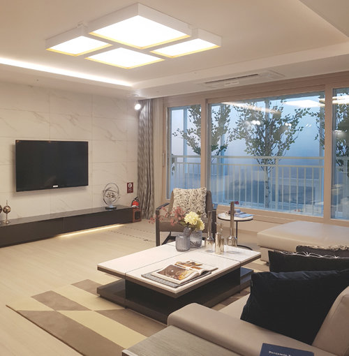 현대엔지니어링이 경북 구미시 송정동에서 분양하는 ‘힐스테이트 송정’ 전용면적 104㎡ 타입 거실 모습. 이 단지는 구미시청 등이 있는 도심 관청가에 들어선다. 현대엔지니어링 제공
