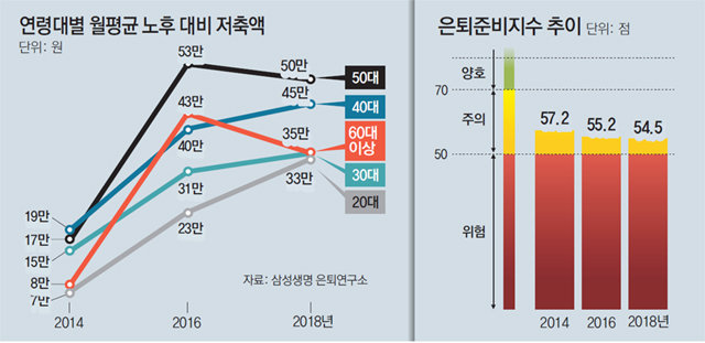 특히 은퇴를 앞둔 50대 이상의 저축 수준이 갈수록 나빠졌다. 20∼40대는 월평균 저축액이 일제히 늘었다. 하지만 50대는 2016년 53만 원에서 올해 50만 원으로, 60대 이상은 같은 기간 43만 원에서 35만 원으로 감소했다. 이 여파로 20∼40대의 은퇴준비지수는 전반적으로 소폭 오른 반면 50대와 60대 이상은 2∼3점 떨어졌다.