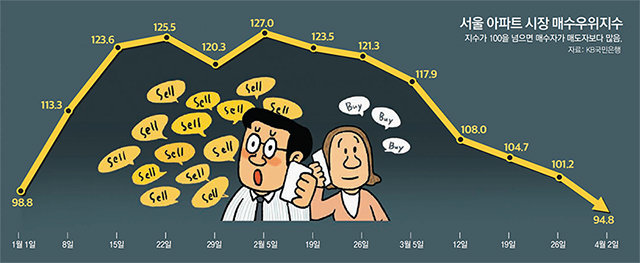 올해 초 달아올랐던 서울의 부동산 시장이 빠르게 식고 있다. 매물이 귀해 ‘부르는 게 값’이었던 1, 2월과 달리 집을 사려는 사람이 줄어들면서 3개월 만에 ‘매수자 우위’ 시장으로 바뀌었다. 집값 상승에 정부 규제도 본격화되면서 집을 사려는 수요가 줄었다는 분석이 나온다.
