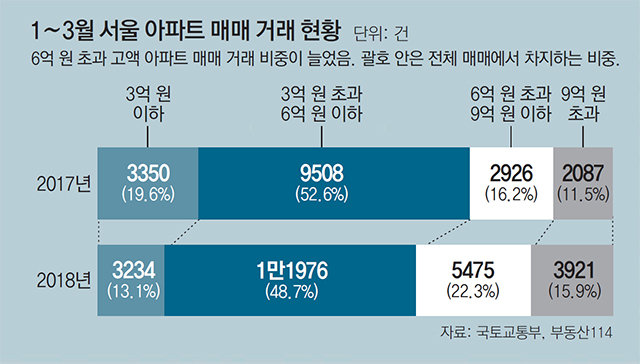 부동산업계는 3개월 만에 매수자 우위 시장으로 전환한 배경으로 단기간에 급등한 집값을 꼽는다. 실제로 올 1분기(1∼3월) 서울에서 거래된 아파트 중 9억 원이 넘는 아파트의 비중이 높아졌다. 부동산114가 국토교통부의 실거래가 공개 시스템을 분석한 결과 이 기간 서울에서 9억 원이 넘는 아파트가 거래된 건수는 3921건으로 전체 거래량(2만4606건)의 15.9%였다. 지난해 1분기(2087건)보다 4.4%포인트 증가했다. 같은 기간 6억 원 초과∼9억 원 이하인 아파트 거래 비중도 16.2%에서 22.3%로 늘었지만 6억 원 이하 아파트 거래 비중은 줄었다.