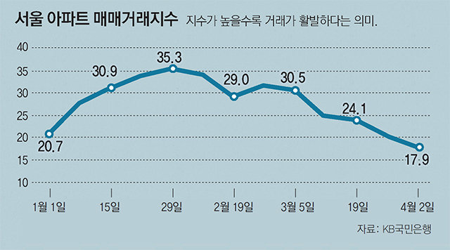 지난해 7월 31일 147.8까지 치솟았던 이 지수는 8·2부동산대책 발표 이후 연말까지 기준선을 밑돌았다. 올 들어 강남을 중심으로 집값이 다시 오르자 매물이 귀한 ‘매도자 우위’ 시장이 형성되면서 올 1월 8일 113.3으로 기준선을 회복했다. 이후 100을 줄곧 웃돌던 지수가 석 달 만에 다시 100 아래로 떨어진 것이다. 매매 거래도 줄었다. 지난주 서울의 아파트 매매거래지수는 17.9로 집계돼 지난해 11월 6일(16.9) 이후 가장 낮았다. 이 지수는 높을수록 거래가 활발하다는 의미다.